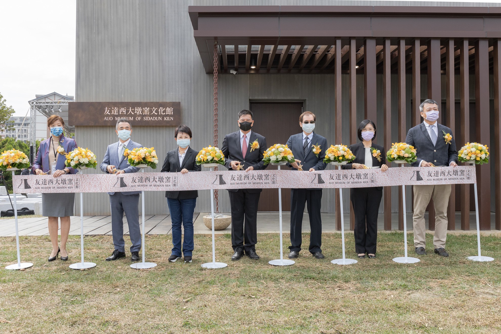 友達西大墩窯文化館開幕剪綵儀式 (左到右:十匯建築師陳嘉芸、互助營造股份有限公司董事長林志聖、臺中市市長盧秀燕、友達永續基金會董事長彭双浪、中科管理局副局長許正宗、友達永續長古秀華、卡爾吉特總經理劉永明)